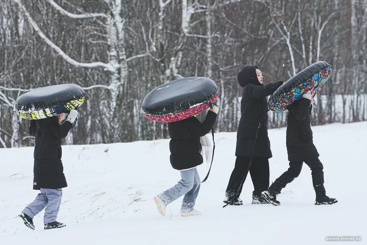 У Гомелі чарга сабралася на спецыяльную цюбінгавую горку. Але ёсць народ і на звычайных снежных схілах.