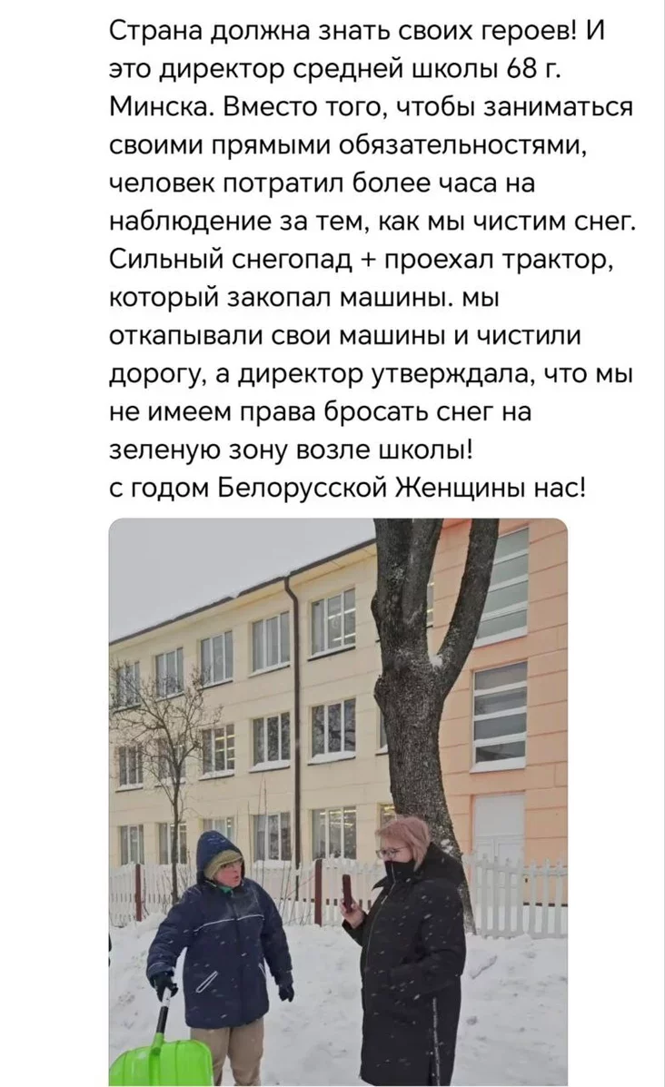Але дырэктарцы школы гэта не спадабалася. Спрэчка была праз тое, куды трэба зграбаць снег. У субцітрах тлумачыцца, нібыта дырэктарка патрабавала, каб людзі граблі снег у свае двары, а не на зялёную зону школы.