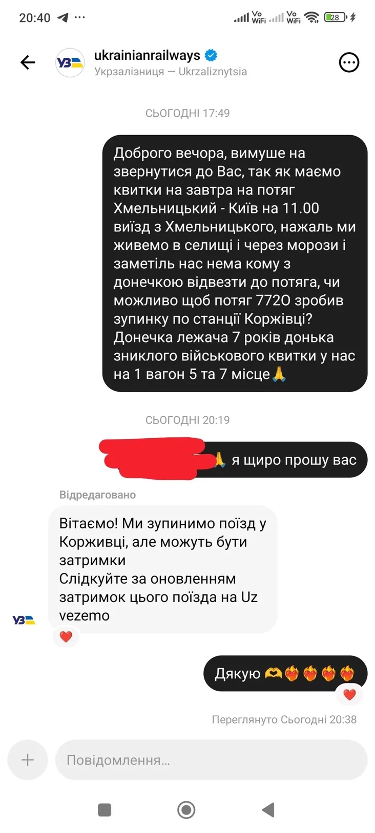 На жаль, мы жывём у пасёлку, і праз маразы ды завіруху нас няма каму з дачушкай адвезці да цягніка. Ці магчыма, каб цягнік 772O зрабіў прыпынак на станцыі Коржыўцы Хмяльніцкага раёна? Дачушка ляжачая, 7 гадоў, дачка зніклага вайскоўца, квіткі ў нас у першы вагон, 5‑е і 7‑е месцы», —