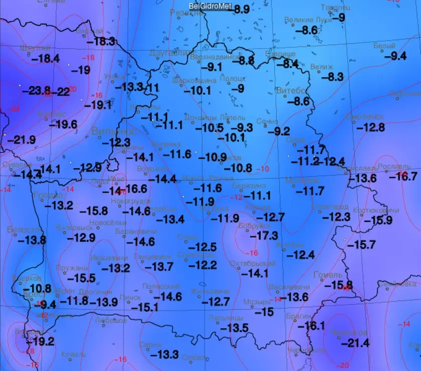 У Налібоцкай пушчы да мінус 16,6°С, у Лідзе — -15,8°С.