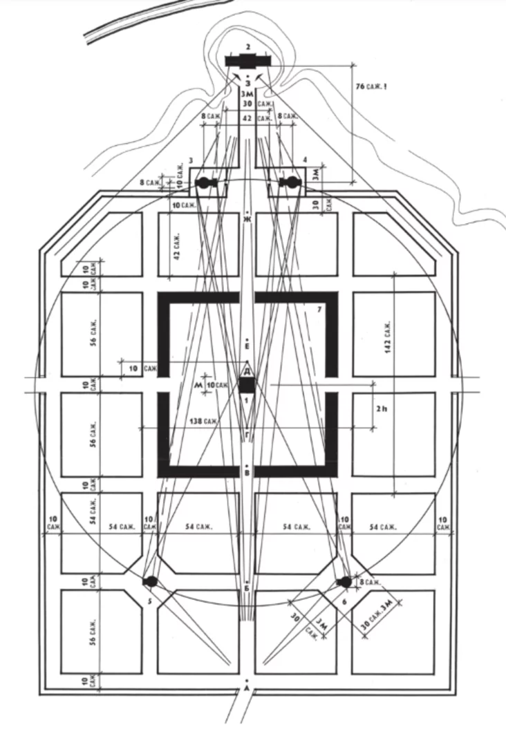 У цэнтры гэтай сістэмы была пабудавана ратуша. Вакол яе, на аднолькавай адлегласці, размясцілі чатыры храмы-ратонды: тры праваслаўныя царквы і адзін касцёл, з якіх да нашых дзён ацалела толькі Спаса-Праабражэнская царква, аўтарства якой прыпісваецца Джакама Кварэнгі.
