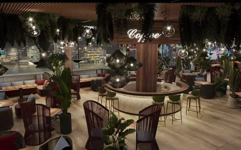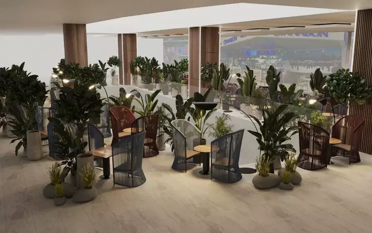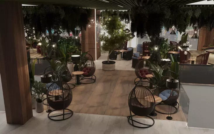 Большую частку прасторы зоймуць рэстаранныя столікі, глыбокія канапы і крэслы з чырвонага дрэва. Са столі будуць звісаць 286 унікальных свяцільняў сферычнай формы з атмасферным святлом. Сярод незвычайнага — цягам усяго года паміж сталамі будуць расці больш за 280 жывых раслін: ад шматгадовых кветак да карлікавых дрэў і жывых фітасцен. Сярод іх будуць і рэдкія віды, якія цяжка знайсці ў Беларусі.