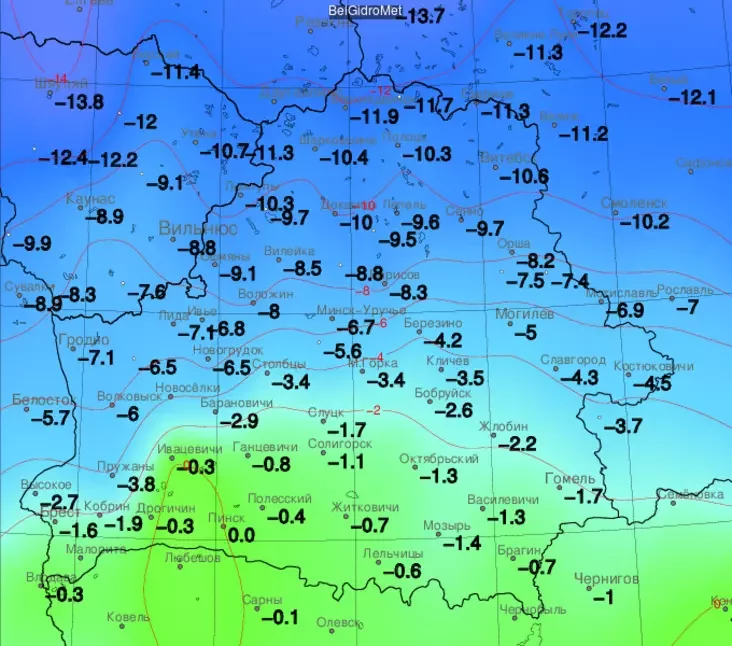 Там было мінус 11,9°С, у Езярышчы было мінус 11,3°С, паведамляе Белгідрамет, які ўлічвае мінімальныя тэмпературы ў перыяд з 21:00 да 09:00 раніцы.