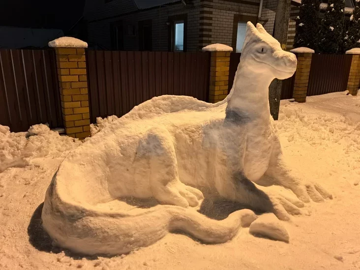 За адны суткі дзяўчына самастойна зляпіла з вялікай гурбы ўражвальную снегавую фігуру цмока. Цяпер скульптура стаіць каля ўвахода ў двор і нібыта «ахоўвае» дом, а мінакі з задавальненнем фатаграфуюцца побач з ёй.