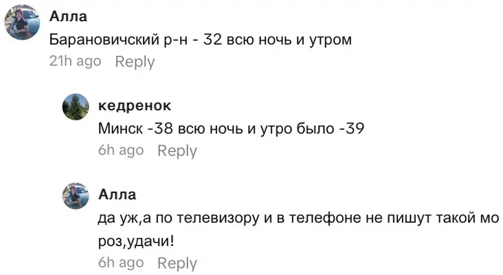 У тыктоку сотні каментарыяў пра тое, што мароз быў мацнейшы, чым афіцыйна абвяшчаюць. Людзі пішуць: ну якія 25? У мяне на тэрмометры было 29. Якія 28? У мяне паказвала 32. І каму верыць? Сайтам ці свайму тэрмометру? Нехта нават лічыць, што па тэлевізары адмыслова паказваюць завышаную тэмпературу, каб не адмяняць працу прадпрыемстваў і заняткі ў школе.