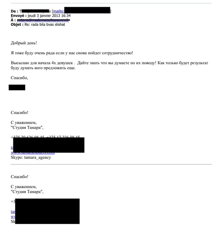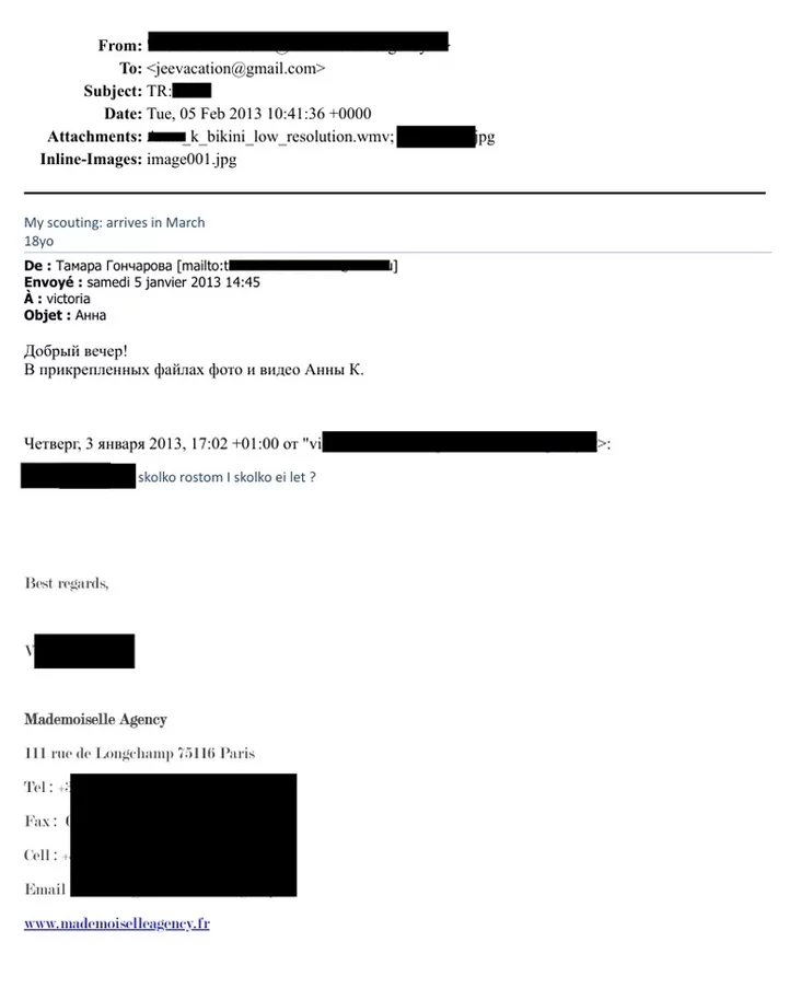 У файлы трапіла перапіска беларускага агенцтва з французскім мадэльным агенцтвам Mademoiselle Agency. Яна вялася напачатку 2013 года.