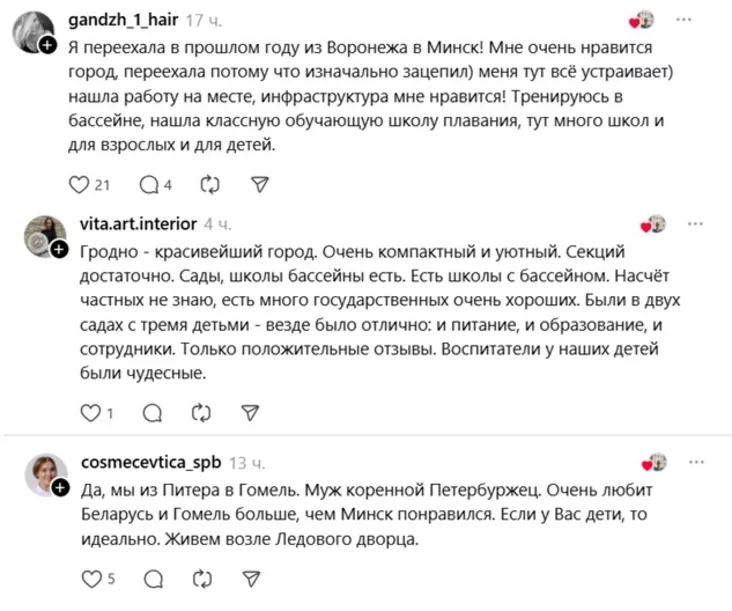 «Ці ёсць тут нехта, хто пераехаў з Расіі жыць у Беларусь? Якія гарады можаце параіць, дзе ёсць развітая прыватная інфраструктура: садок, школа, басейны і розныя секцыі?» — звярнуўся па параду жыхар Расіі, які рэкламуе сябе як інтэрнэт-маркетолага.