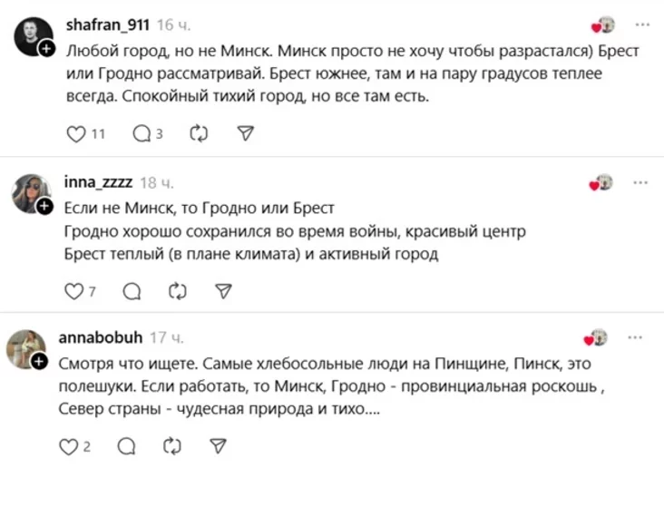 «Любы горад, але не Мінск. Мінск проста не хачу, каб разрастаўся) Брэст або Гродна разглядай. Брэст паўднёвейшы, там і на пару градусаў цяплей заўсёды. Спакойны ціхі горад, але ўсё там ёсць…»