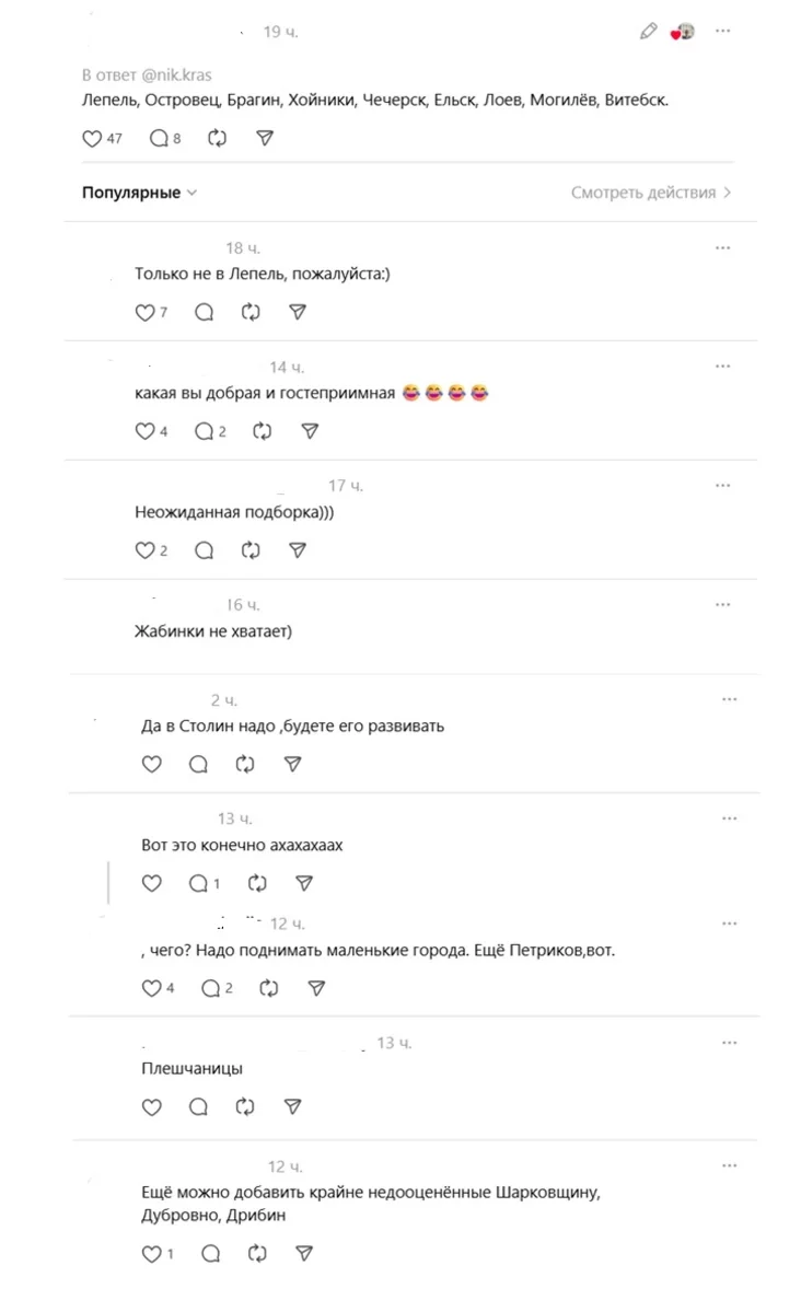 «Мінск, Гродна. І не слухайце асобных персанажаў — яны самі, як правіла, пішуць не з Беларусі і злыя на ўвесь свет. Мы рады ўсім нармальным людзям!»