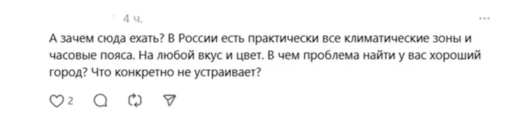 «А навошта сюды ехаць? У Расіі ёсць практычна ўсе кліматычныя зоны і часавыя паясы. На любы густ і колер. У чым праблема знайсці ў вас добры горад? Што канкрэтна не задавальняе?» — пацікавіўся яшчэ адзін карыстальнік.