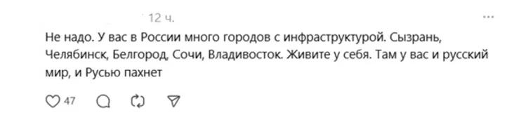 «Не трэба. У вас у Расіі шмат гарадоў з інфраструктурай. Сызрань, Чалябінск, Белгарад, Сочы, Уладзівасток. Жывіце ў сябе. Там у вас і рускі свет, і Руссю пахне».