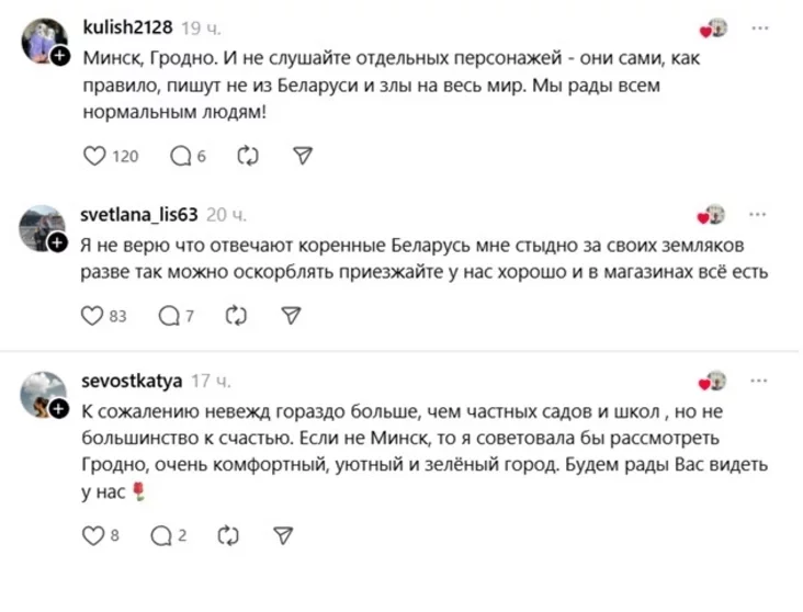 «Ужо ніякія. У Беларусь варта было ехаць у прамежку 2011—2019. А пасля 2019‑га ехаць трэба з Беларусі», — з сумам заўважыў яшчэ адзін каментатар.