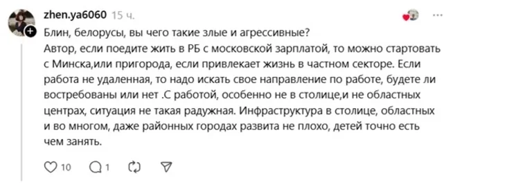 «Блін, беларусы, вы чаго такія злыя і агрэсіўныя? Аўтар, калі паедзеце жыць у РБ з маскоўскай зарплатай, то можна стартаваць з Мінска або прыгарада, калі вабіць жыццё ў прыватным сектары. Калі работа не аддаленая, то трэба шукаць свой кірунак па рабоце, ці будзеце вы запатрабаваныя. З работай, асабліва не ў сталіцы і не ў абласных цэнтрах, сітуацыя не такая вясёлкавая. Інфраструктура ў сталіцы, абласных і шмат у чым нават раённых гарадах развітая неблага, дзяцей дакладна ёсць чым заняць».