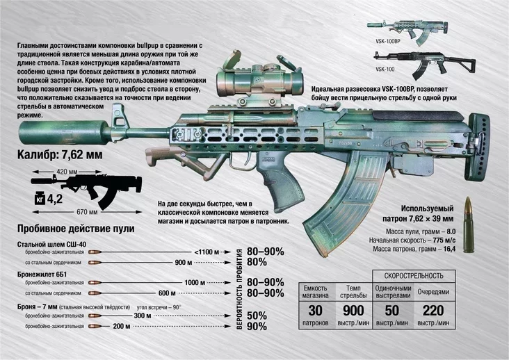 Па даных ТАСС, аўтамат VSK-100 па памерах блізкі да АК-74: даўжыня — 915 мм, вышыня — 265 мм, шырыня — 6,5 мм. Вага без магазіна — 4,3 кг. Аўтамат прызначаны для патронаў калібру 7,62×39 мм, магазін змяшчае 30 патронаў. Рэжым стральбы — паасобны або аўтаматычны, тып замыкання — паваротны, механізм з бакавым газавым рухавіком.