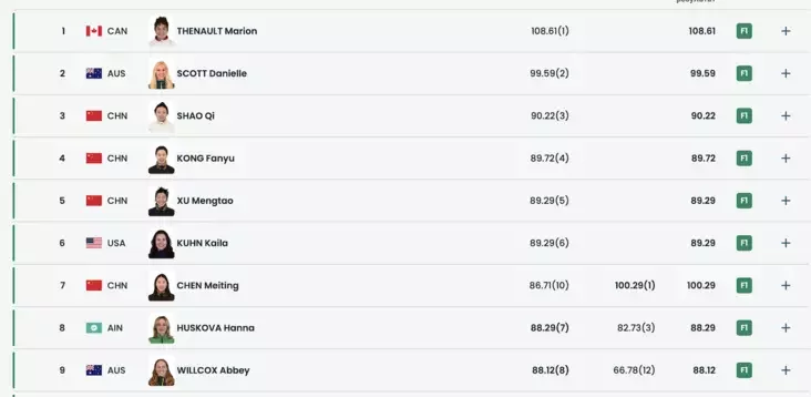 У фінал выйшлі 12 найлепшых. У канадкі Марыён Тэно, што заняла першае месца ў кваліфікацыі — 108,61 бала, у трэцяга месца — 90,22.