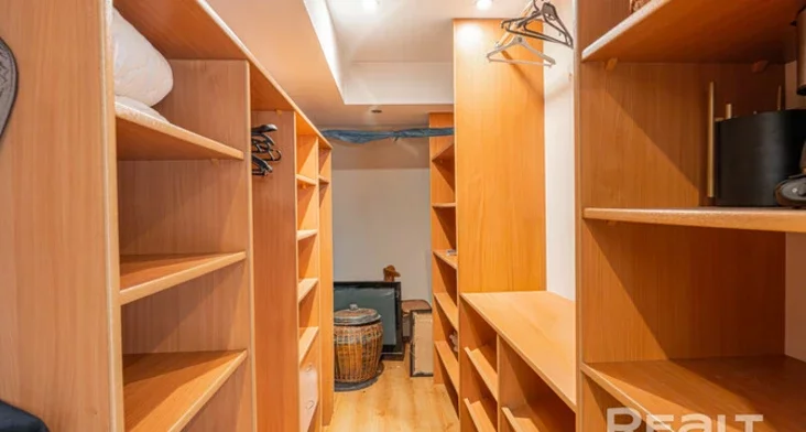 Агульная плошча двухпавярховай кватэры — 167 квадратаў. На жылы метраж прыходзіцца 111 метраў. На першым узроўні — гасцёўня, сумешчаная з кухняй, спальня, санвузел і гардэробная.