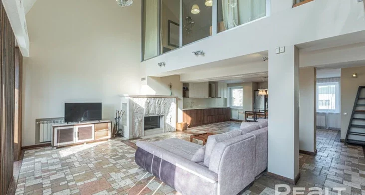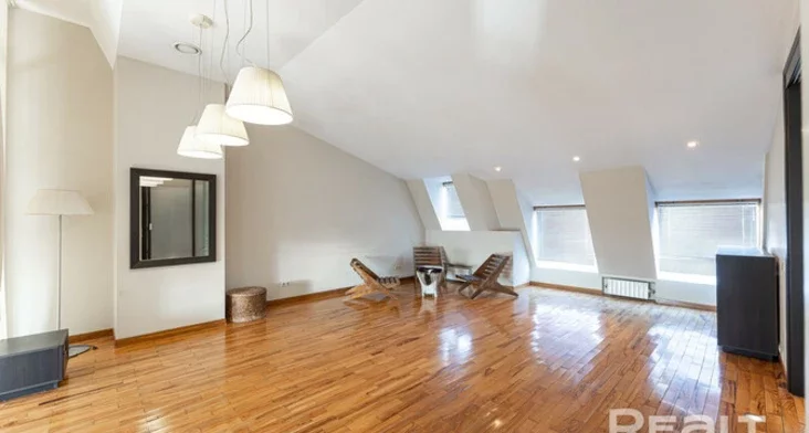 Нестандартную двухузроўневую кватэру ў сталінцы на вуліцы Камсамольскай выставілі на продаж. У ёй мансардныя вокны, столі ў самай высокай кропцы дасягаюць пяці метраў, а яшчэ ёсць камін.