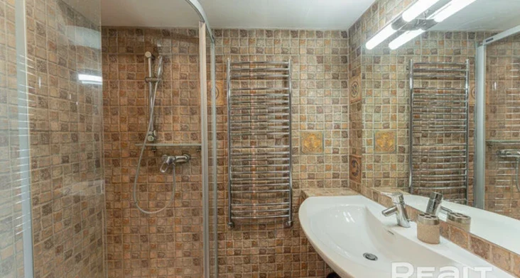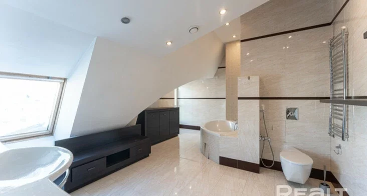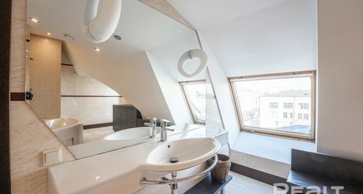Адна з ключавых фішак гэтай кватэры — уласны выхад на дах з вялізнага санвузла. Як выглядае гэта нестандартнае жыллё, піша Realt.by.