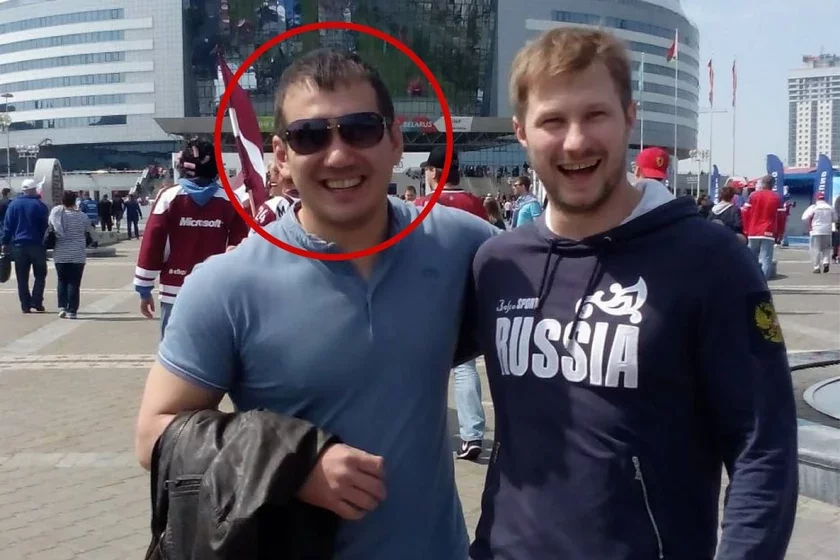 На фота ўверсе — чэмпіянат свету па хакеі 2014 года, Мінск, спартыўнага мужчыну ў майцы «Расія» прыабдымае іншы трэніраваны малады чалавек. Сяргей Радкевіч раней служыў у беларускай «Альфе», а цяпер камандзір разведупраўлення звышсакрэтнага расійскага «Цэнтра 795».