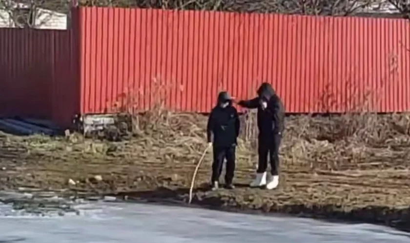 Выйшаўшы на вуліцу, дзеці ўбачылі мясцовы вадаём і пачалі гуляць на лёдзе.