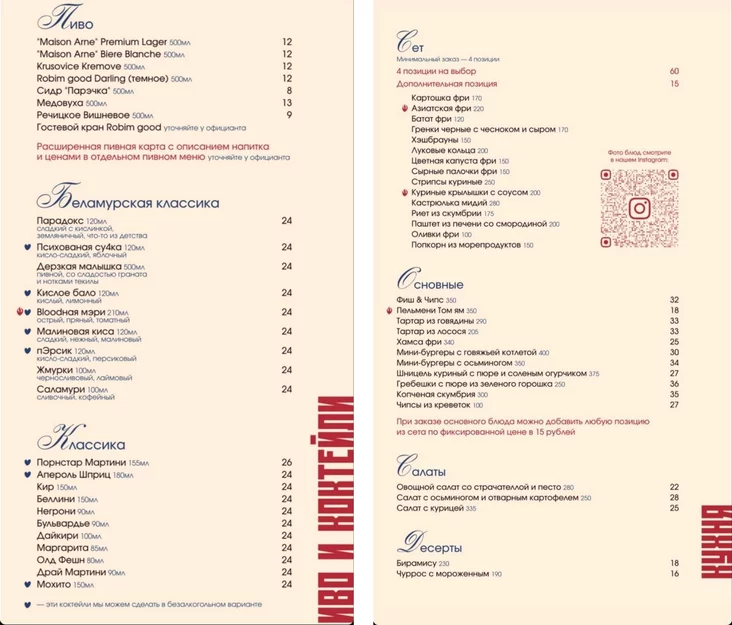 Сэт з чатырох пазіцый каштуе 60 рублёў, асноўныя стравы каштуюць ад 18 да 36 рублёў, салата — 22‑28 рублёў, дэсерты — 16‑18 рублёў.