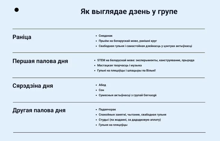 Групу адкрыюць, калі набярэцца мінімум 15 дзетак. Цяпер прымаюць заяўкі на малых ад 2 да 6 гадоў. Група можа быць аднаго ўзросту або змешаная — усё залежыць ад заявак. Збор заявак працягнецца да канца чэрвеня.