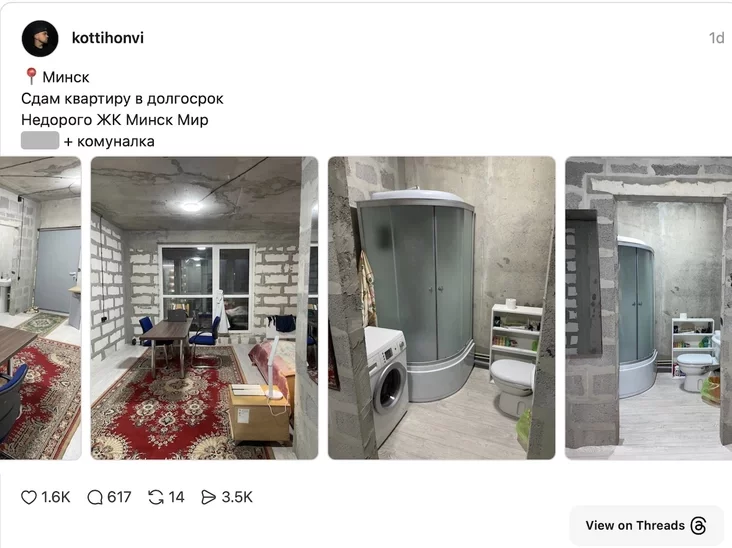 Нядаўна малады чалавек па імені Ціхан размясціў у Threads аб'яву аб здачы кватэры без аздаблення. Канешне ў «Мінск-Свеце». Аднапакаёўцы нанеслі «макіяж»: на бетонную падлогу паклалі дыван, паставілі мэблю, у ваннай змантавалі сантэхніку. За жыццё без вынаходстваў уласнік прасіў усяго $150 за месяц. Нягледзячы на лаяльную цану, каментатары ўсё роўна абураюцца, піша Onliner.by.