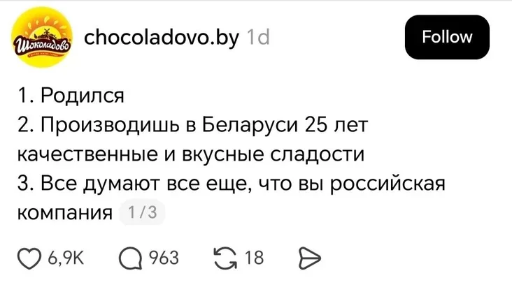 У Threads кампаніі з’явіўся допіс: «Нарадзіўся. Вырабляеш у Беларусі 25 гадоў якасныя і смачныя прысмакі. Усе думаюць усё яшчэ, што вы расійская кампанія».