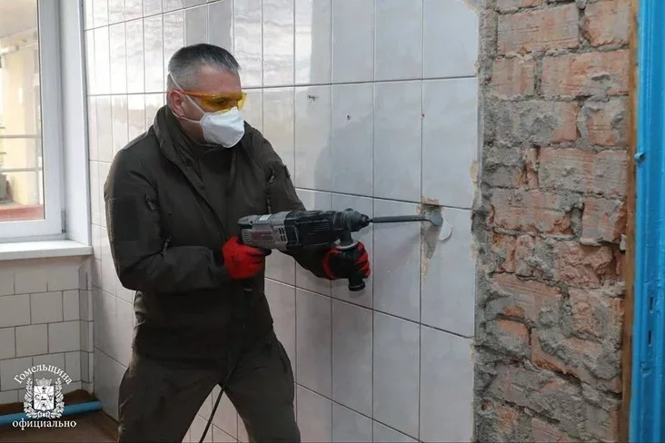 А вось так дэманструе працоўны энтузіязм на рэканструкцыі той жа Мазырскай радзільні старшыня Гомельскага аблвыканкама Іван Крупко: