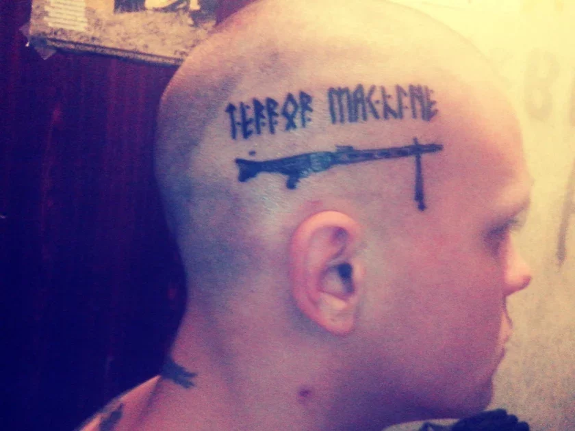 Na hrudziach u jaho nabita 88 — heta ličbavaja abrevijatura, jakaja aznačaje «Chajl Hitler».