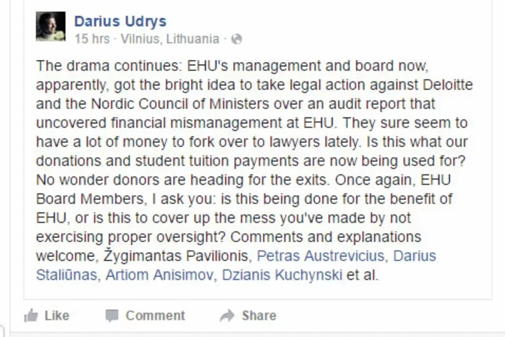 Zajavu Łonsdejł u siabie ŭ fejsbuku rezka raskrytykavaŭ były prarektar EHU Darus Udrys: