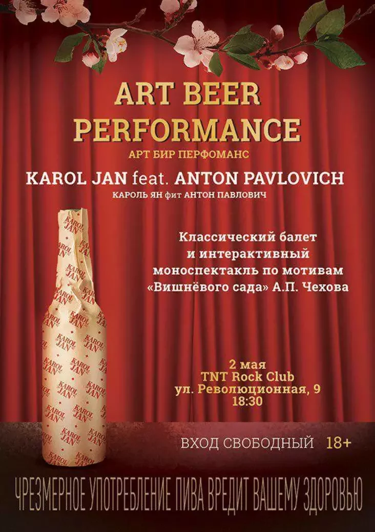 2 maja scena staličnaha TNT Rock Club na adzin viečar pieratvorycca ŭ teatralnuju scenu. Z nahody prezientacyi novaha hatunku višniovaha piva ad brenda «Alivaryja» Karol Jan Ruby mienčukam pakažuć alternatyŭnuju viersiju «Višniovaha sadu» Čechava. Art Beer Performance: Karol Jan feat. Anton Pavlovich — tvorčy ekśpierymient, u jakim śmieła złučyli kłasičny balet i interaktyŭny monaśpiektakl.