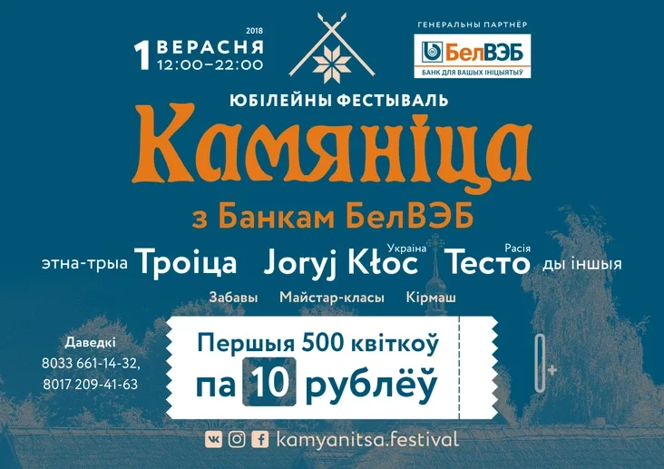 1 vierasnja ŭ Muziei narodnaj architektury i pobytu pad Minskam pry padtrymcy AAT «Bank BiełVEB» adbudziecca jubilejny — dziasiaty pa liku — fiestyval «Kamianica». Arhanizatary abviaścili troch pieršych chedłajnieraŭ i zapuścili ŭ prodaž pieršyja 500 kvitkoŭ pa 10 rubloŭ.
