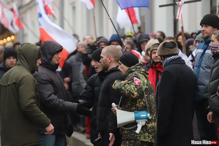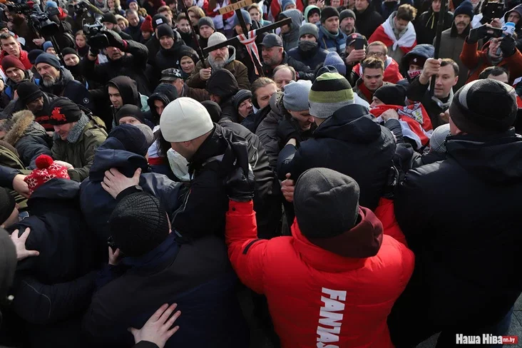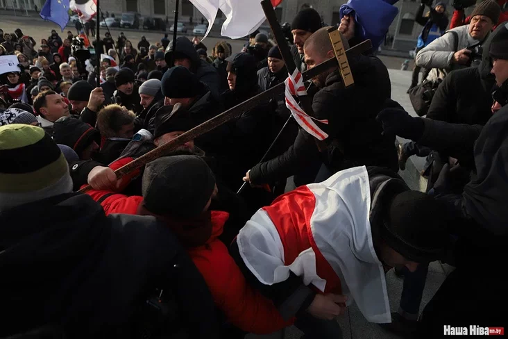 Pačałasia patasoŭka. Maksim Viniarski z «Jeŭrapiejskaj Biełarusi» ŭpaŭ z prystupak i padniaŭsia. Pratestoŭcy kryčać «Hańba».