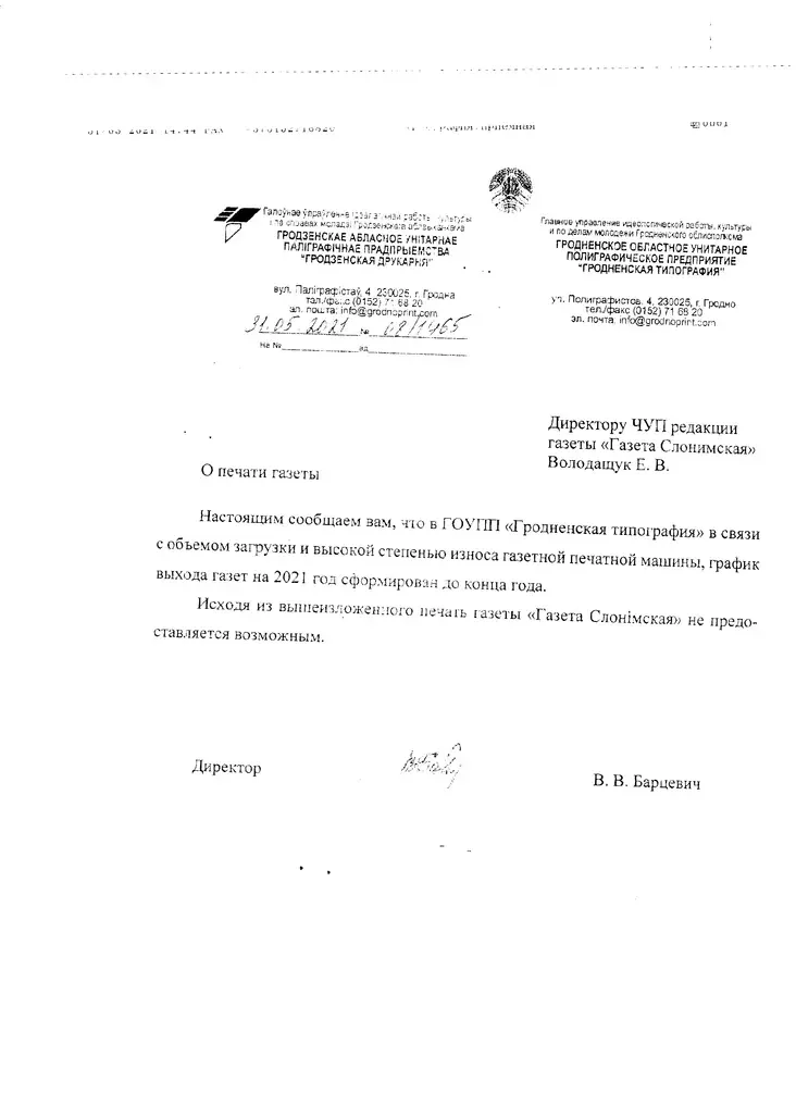 Adnak hrodzienskaja drukarnia, dzie raniej drukavałasia «HS», dasłała list z admovaj.