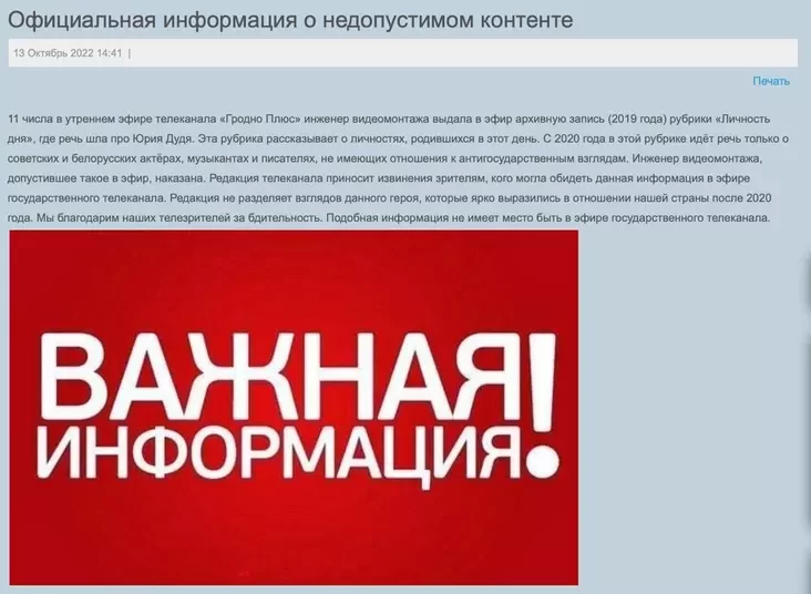 «Inžynier videamantažu, jakaja dapuściła takoje ŭ efir, pakaranaja», — havorycca ŭ paviedamleńni.