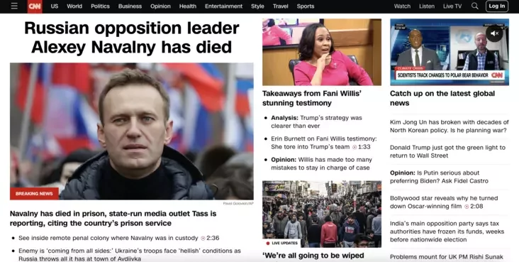 BBC ilustruje navinu pra śmierć palityka jaho turemnym fota, a taksama raźmiaščaje apošniaje videa Alaksieja z kałonii — na im Navalny žartuje. Miedyja adznačaje, što Navalny — ščyry krytyk Pucina, i što jon znachodziŭsia za kratami z 2021 hoda pa abvinavačańniach, jakija byli šyroka ŭspryniatyja jak palityčna matyvavanyja.