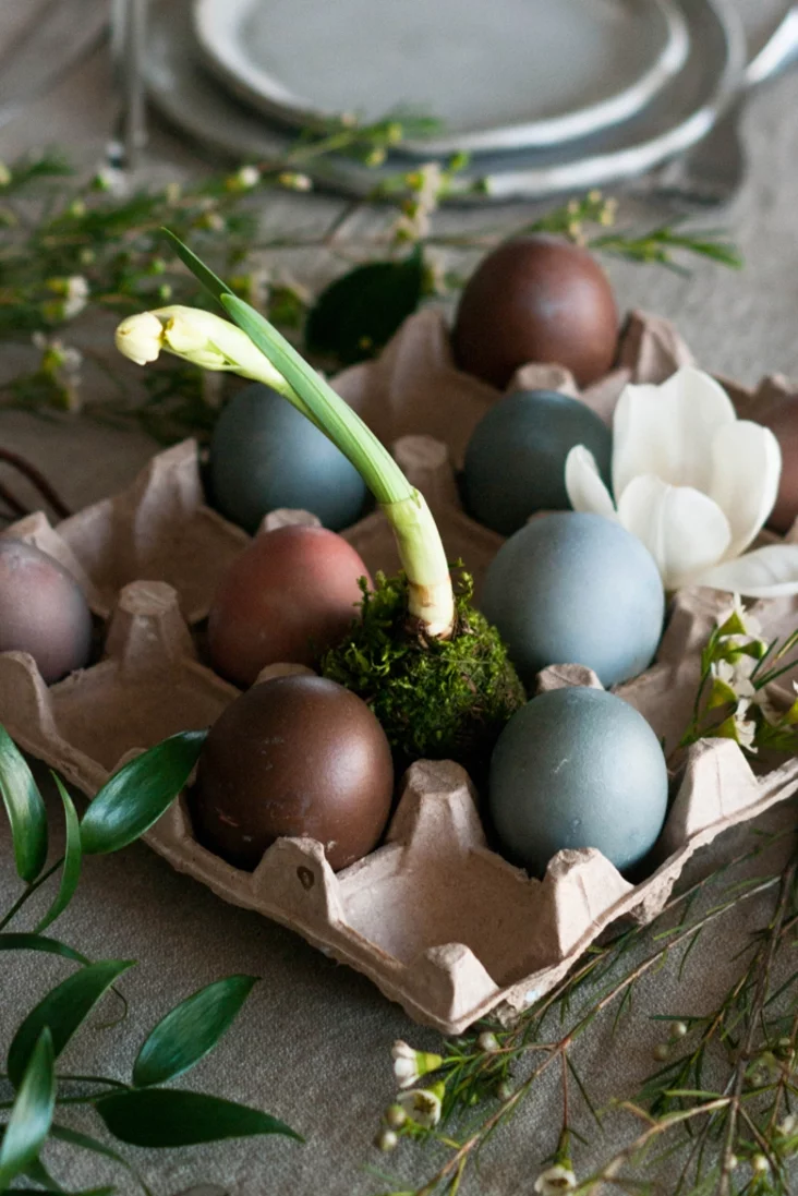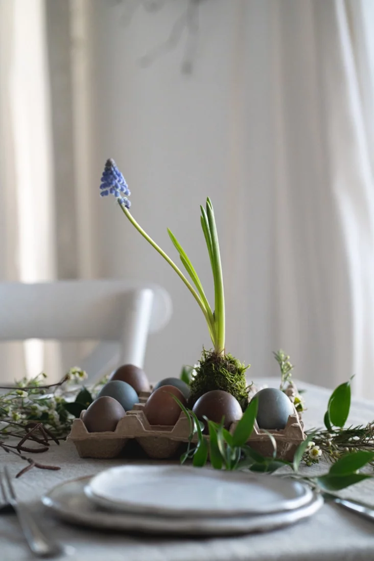Prosty, ale niečakana stylovy dekor — padstaŭka dla jajek z kardonnaj upakoŭki. Kali raskłaści ŭ joj jajki nie ŭ kožnaj jačejcy, a pakinuć pustyja miescy, da taho ž u niekatoryja ź ich zamiest jajek pakłaści kvietački, — kampazicyja budzie vyhladać cikava i dynamična. Niezvyčajna ŭ takich padstaŭkach vyhladajuć maleńkija kakiedamy ź viesnavymi cybulnymi kvietkami.