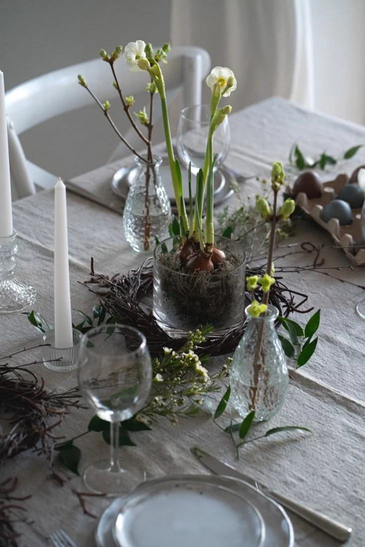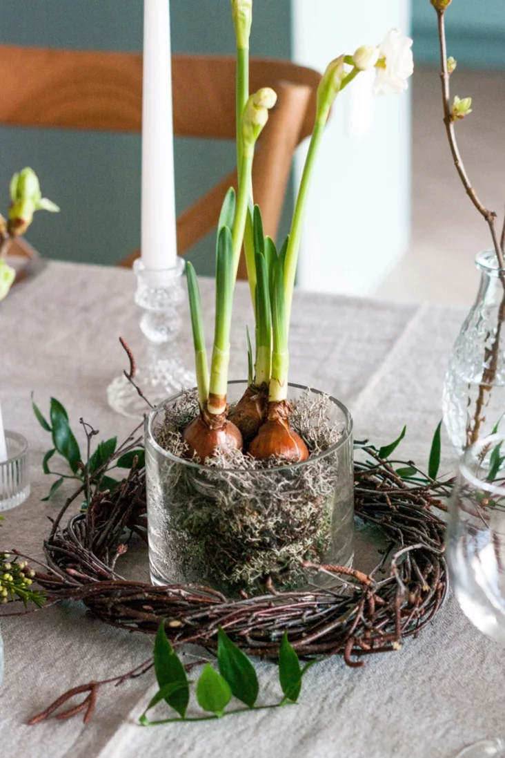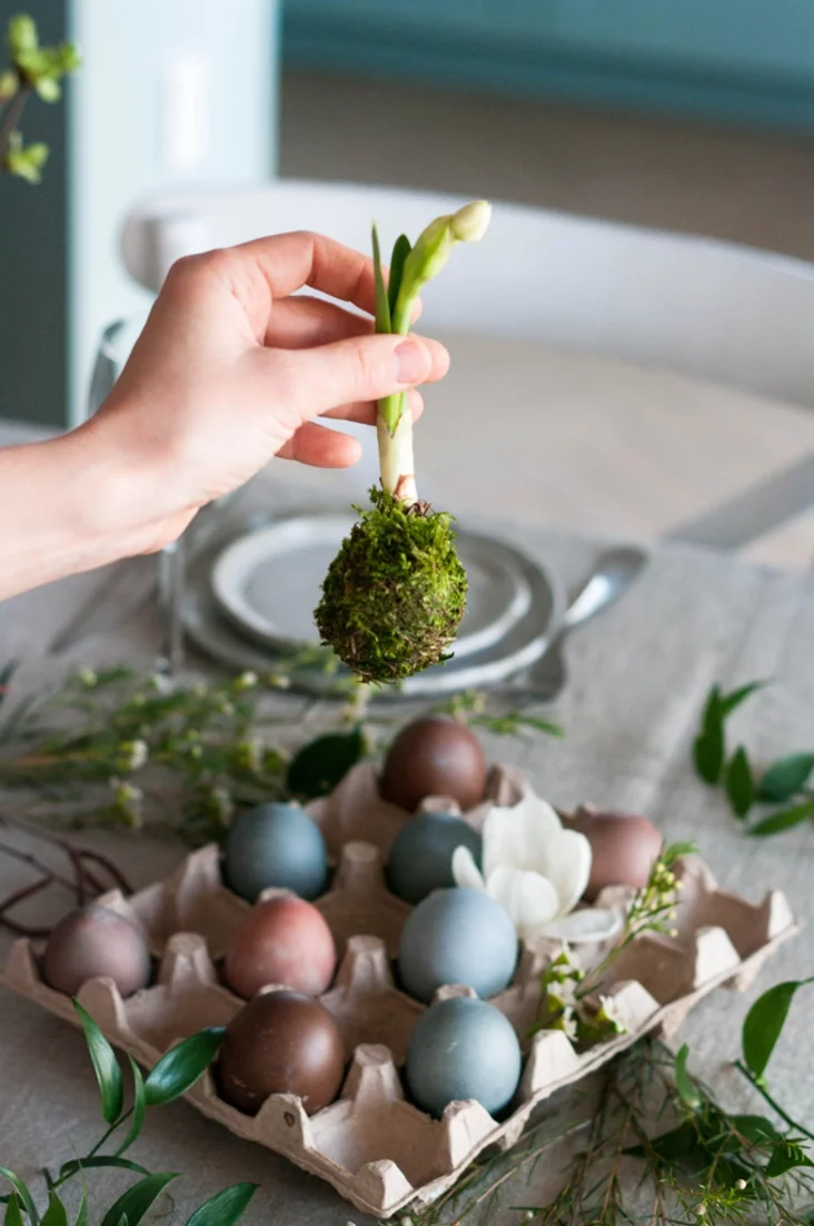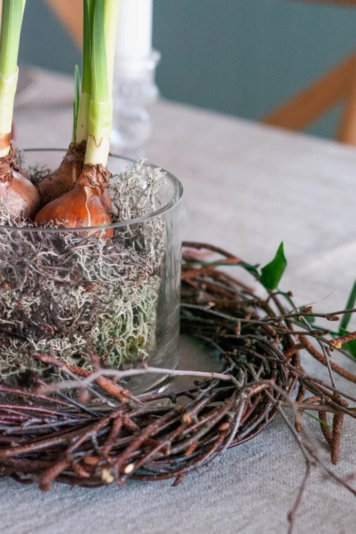Prazrystaja šklanaja vaza, napoŭnienaja mchom, moža być sama pa sabie elemientam dekoru, a možna raźmiaścić u joj cybulinki ŭ kviecieni — papiarednie admyjcie ich ad hleby vadoj. Kali hety dekor budzie ŭ vas karotkačasovy, to hetaha dastatkova, a kali chočacie, kab jon pastajaŭ daŭžej, to treba nalić u vazu paŭsantymietra vady, abo apyrskvać / uvilhatniać moch.