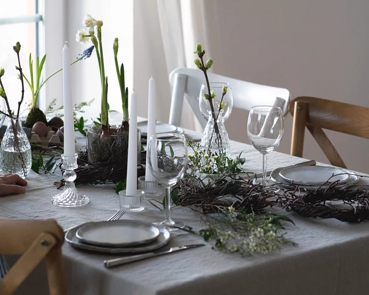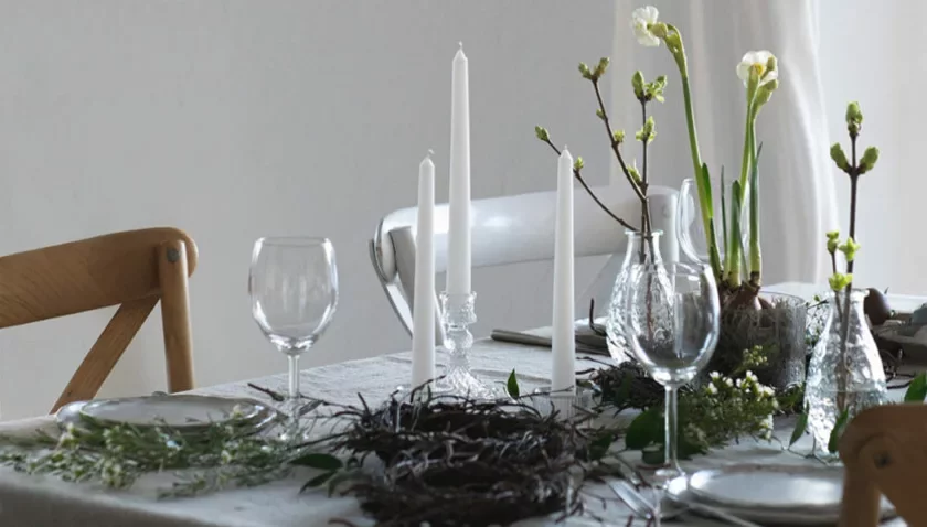 Prytrymlivajciesia pryrodnaj palitry koleraŭ (zialonyja i biełyja adcieńni) i naturalnych faktur (ilniany abrus, kieramičny posud). Vykarystoŭvajcie kantrasty: biełyja kvietki i ciomnyja biarozavyja halinki, miakkija piorki i ćviordyja pavierchni posudu, hładkija vazy i fakturnaje škło. Dadavajcie prazrystyja kielichi, vytančanyja śviečki, halinki bezu ź zialonymi pupyškami.