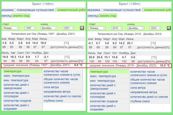 Tak, naprykład, tolki za apošnija 25 hadoŭ siaredniaja hadavaja tempieratura ŭ Breście vyrasła z 8,6 hradusa ŭ 1997-2001 hadach da 10 hradusaŭ u 2018-2023 hadach.
