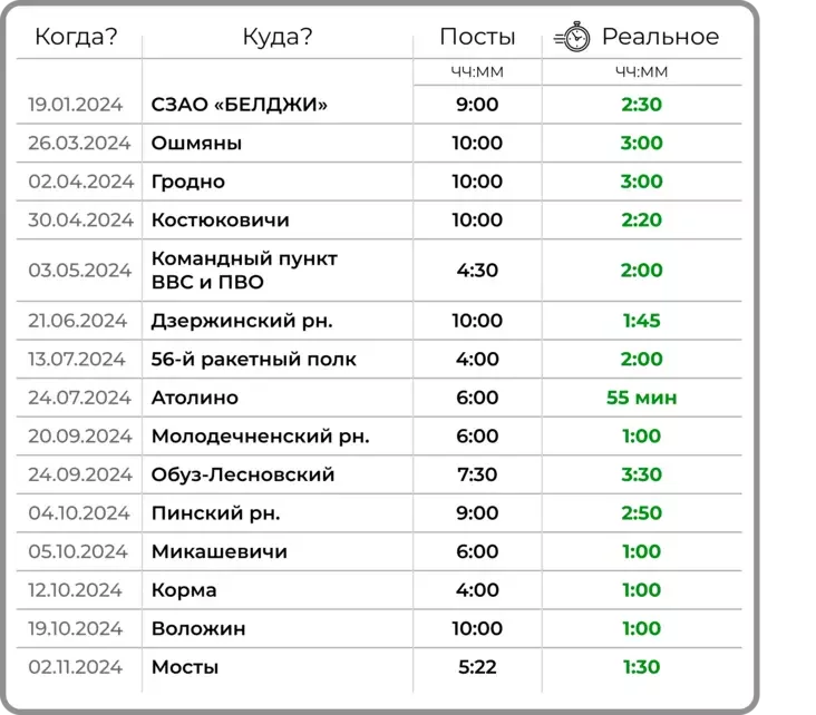 Prajekt piša, što jak minimum u 15 pajezdkach u 2024 hodzie Łukašenka pravodziŭ značna mienš času, čym sprabavała pakazać jaho pres-słužba. Jany zaŭsiody pišuć, kali jon pryjazdžaje, ale amal nikoli nie paviedamlajuć, kali jon źjazdžaje.