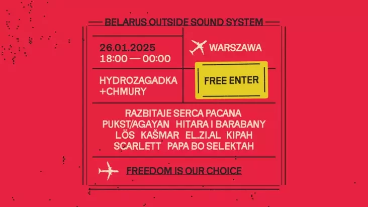 26 studzienia ŭ Varšavie, Krakavie, Poznani i Hdańsku projdzie fiestyval Belarus Outside Sound System, jaki abjadnaje ŭdzielnikaŭ vakoł kaštoŭnaściej svabody i salidarnaści praz muzyku i mastactva. Chedłajnierami festu ŭ roznych haradach stanuć biełaruskija prajekty SOYUZ i Yegor Zabelov, SHUMA i Anastasia Rydlevskaya, WTBSK i Mustelide, Raźbitaje Serca Pacana i Pukst, a da jaho arhanizacyi dałučacca šmatlikija łakalnyja supolnaści z art-markietami, vystavami i majstar-kłasami, piša Reform.news.