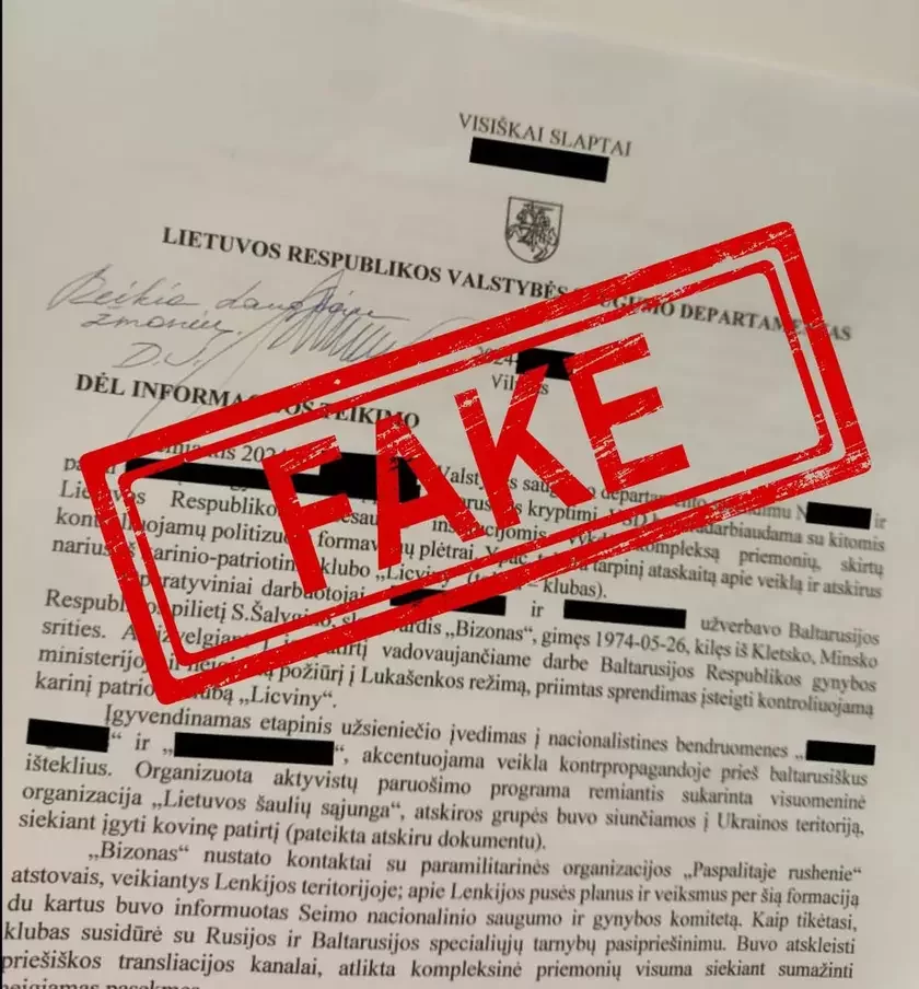 Litoŭski Departamient dziaržaŭnaj biaśpieki (DDB) papiaredžvaje pra raspaŭsiudžańnie fejkavaha dakumienta ŭ Facebook. U dakumiencie śćviardžajecca, što litoŭskaja raźviedka rychtuje vajenizavanyja hrupy biełarusaŭ, paviedamlaje LRT.