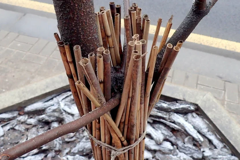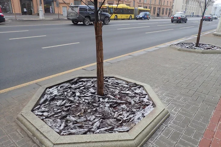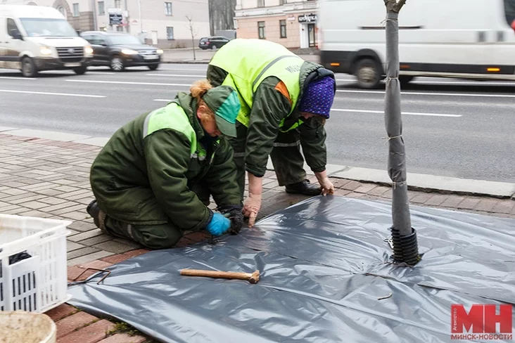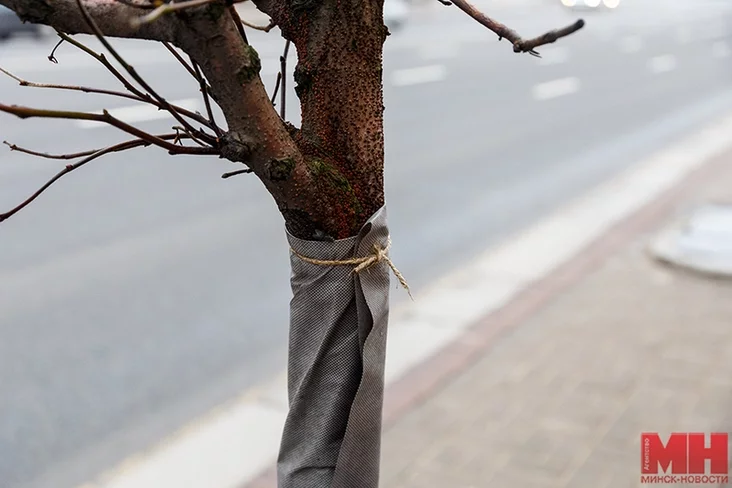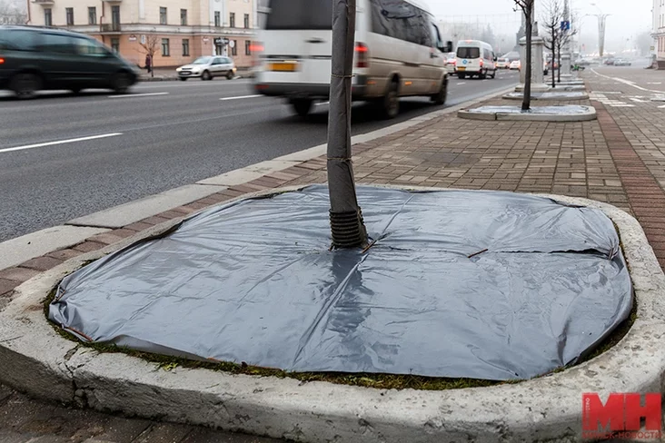 Takoje zimovaje «adzieńnie» zaŭvažana na ŭčastku praśpiekta ad HUMa da płoščy Niezaležnaści. Raniej łunki dreŭ na praśpiekcie ŭciaplali plonkaj, a stvały abhortvali spanbondam.