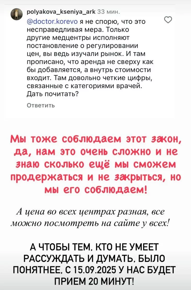 — Košt pryjomu doktara — heta zarobak doktara (15—20%) plus vypłaty ŭ Fond sacyjalnaj abarony nasielnictva i padachodny padatak (15%), plus zarobki ŭsiaho absłuhoŭvajučaha piersanału (administratary, juryst, miedsiastra, dyrektar, buchhałtar, koł-centr — heta jašče 20%), arhanizacyja pryjomu (pamiaškańnie, staronnija arhanizacyi, raschodnyja materyjały i inšaje — 30—40%), plus prybytak zasnavalnikaŭ (3—5%), plus padatak.