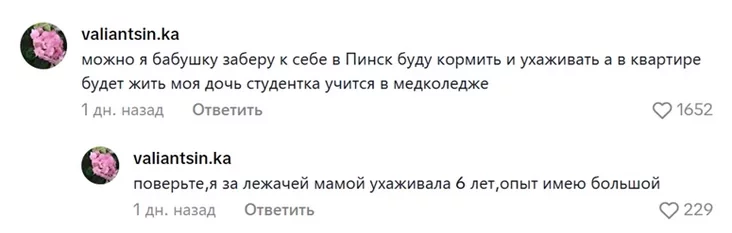 «Možna ja babulu zabiaru da siabie ŭ Pinsk? Budu karmić i dahladać. A ŭ kvatery budzie žyć maja dačka-studentka, vučycca ŭ miedkaledžy. Paviercie, ja lažačuju mamu dahladała 6 hadoŭ, praktyku vialikuju maju».