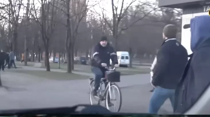 U siužecie pakazali kadry zatrymańnia Dziamjanava — jon jechaŭ pa horadzie na rovary.