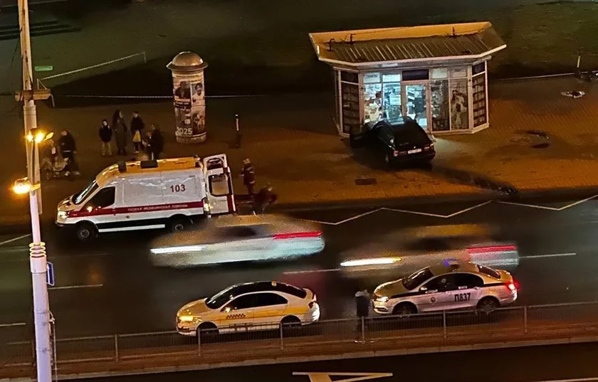 U Minsku na prypynku kala stancyi mietro «Michałova» aŭtamabil BMW urezaŭsia ŭ kijosk «Biełsajuzdruku».