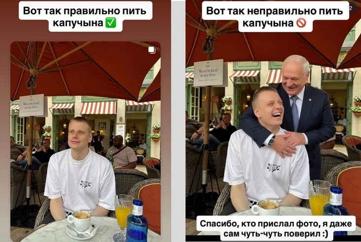 Stendapier Słava Kamisaranka na situacyju adreahavaŭ łakanična: zapościŭ u storys fota, na jakim pje kavu ŭ kafe, i padpisaŭ: «Voś tak pravilna pić kapučyna». Ale padpisčyki chutka zaryjentavalisia i dadali na fota Łukašenku, jaki piaščotna abdymaje komika.